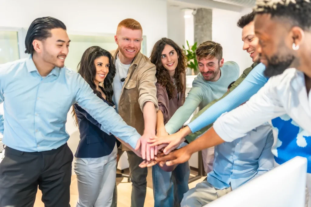 Un groupe de personne qui réunissent leur main au centre